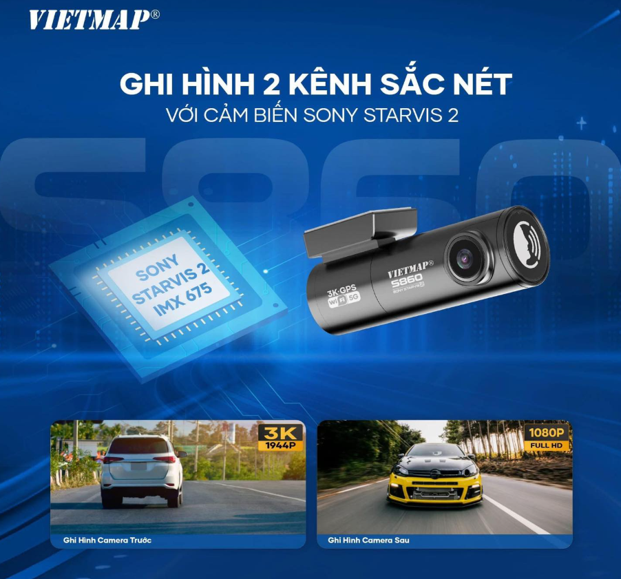 Vietmap S860 được nâng cấp mạnh mẽ với camera trước độ phân giải 3K (1944P), vượt trội hơn hẳn phiên bản trước đó (KC01 chỉ có 2K – 1440P). Kết hợp với camera sau Full HD 1080P, thiết bị có thể ghi lại toàn cảnh hành trình của bạn một cách chi tiết, kèm theo thông tin tốc độ và tọa độ xe theo thời gian thực.