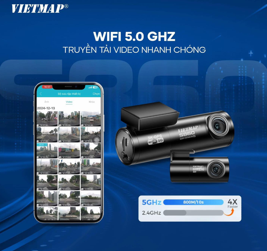 Camera hành trình Vietmap S860 được trang bị wifi băng tần 5GHz tốc độ cao, cho phép truyền tải dữ liệu nhanh chóng. Chỉ với ứng dụng Vietmap REC, bạn có thể dễ dàng xem lại, tải video về điện thoại hoặc cập nhật dữ liệu cảnh báo mới một cách tiện lợi.