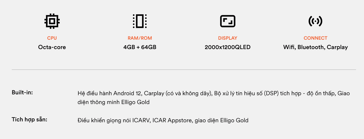 • Dễ dàng tận hưởng các ứng dụng như ICAR Entertainment, Google Maps, và nhiều tính năng khác với tốc độ phản hồi nhanh và hiệu suất ổn định.